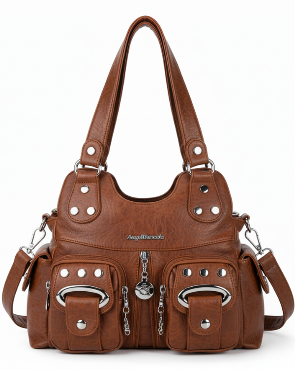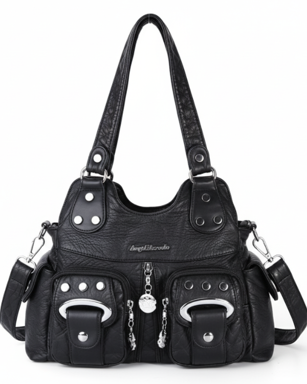Angel Shoulder Bag  Meet the Angel bag — where bold style meets everyday practicality.Crafted in premium vegan leather with a textured finish, this statement piece brings an edgy-chic vibe to any outfit. Designed with multiple front pockets and metallic hardware details, the Angel bag is perfect for keeping your essentials...